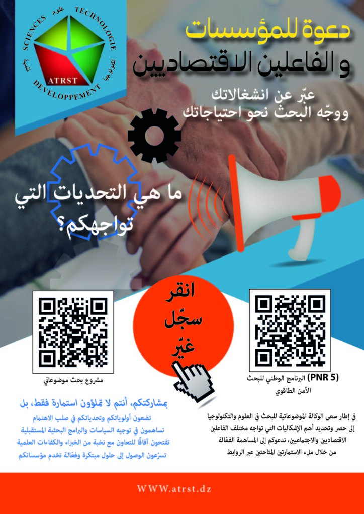 Dans cette optique, l’Agence Thématique de Recherche en Sciences et Technologie vous invite à vous engager activement dans la construction de l’avenir de la recherche et du développement en Algérie.